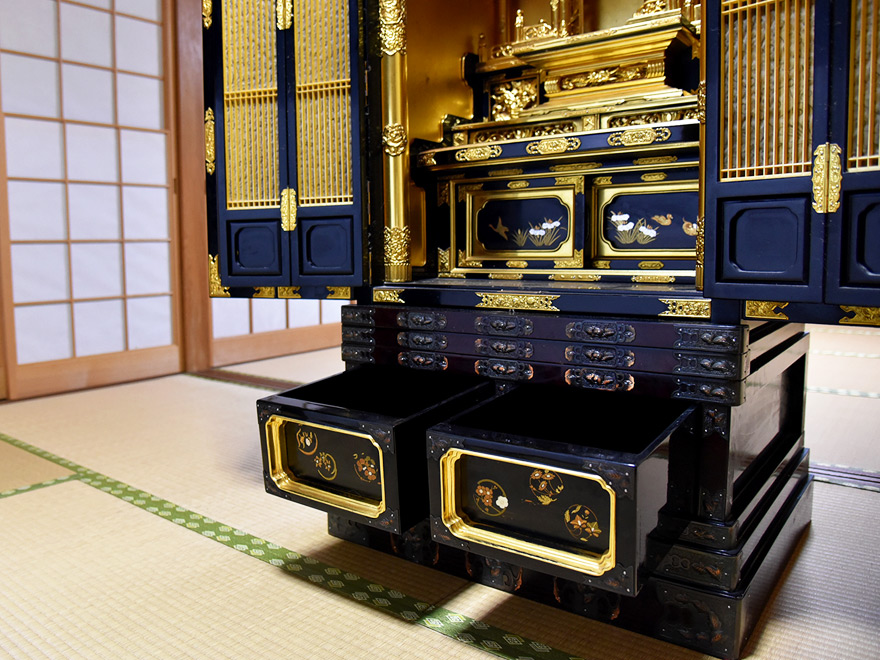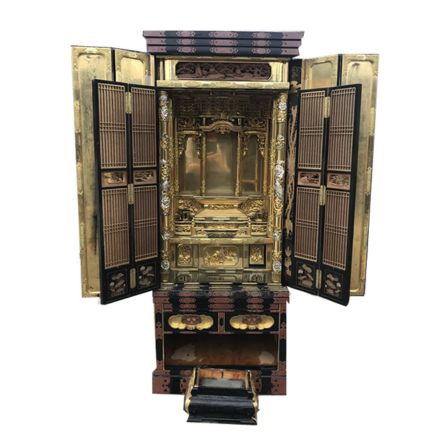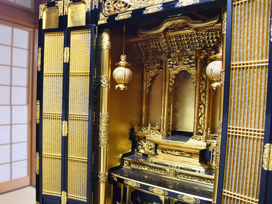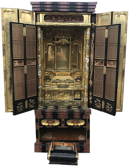 一つは表面に金箔を貼った漆塗りの「金仏壇」です。