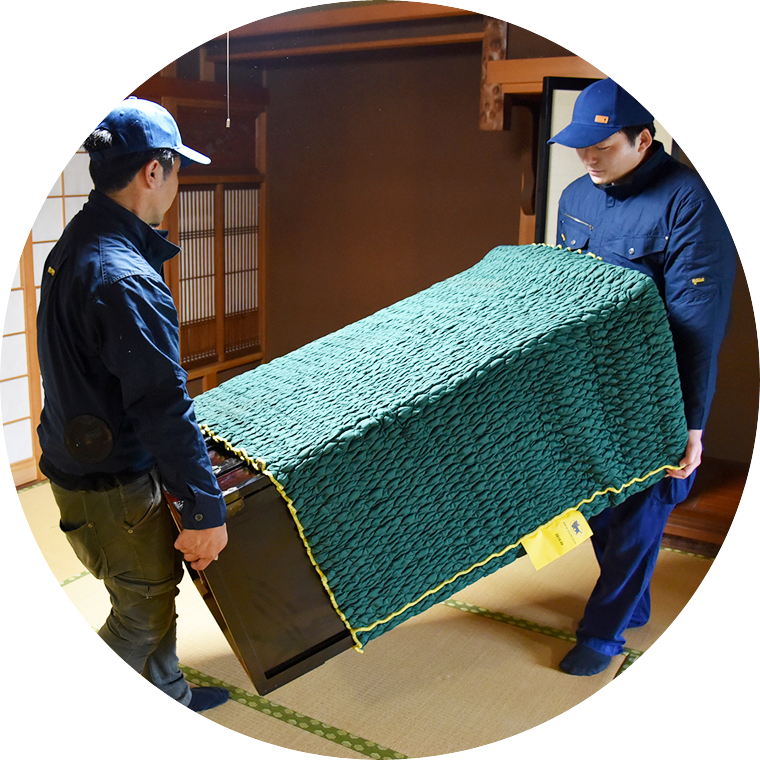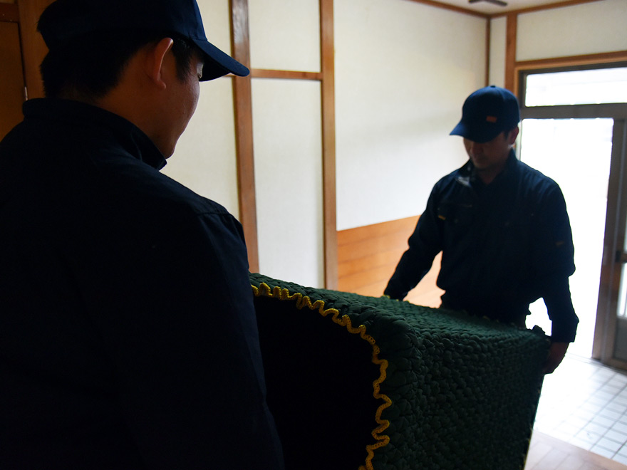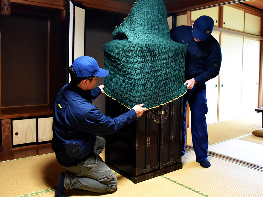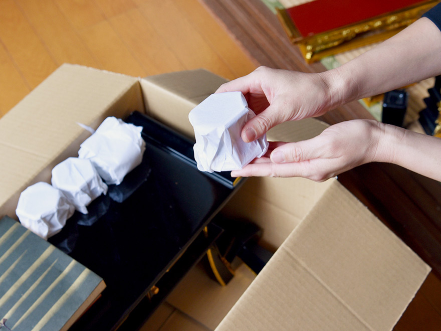 【梱包】所定の位置から出された仏壇を梱包します。配送スタッフが対応いたします。