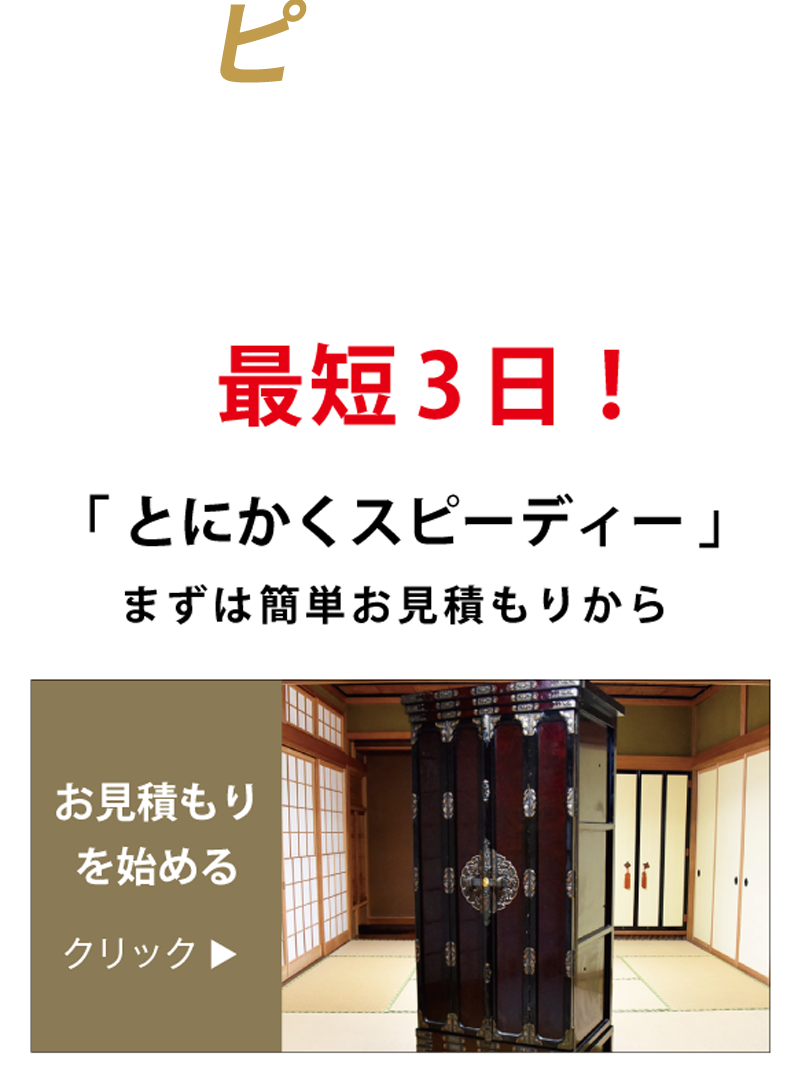 当方、大型の仏壇だったのですが、簡単見積もりで費用がわかったので即決しました。心配していた搬出も、手慣れた手つきで思ったよりも簡単に済みました。丁寧に扱っていただきとても満足しています。後日供養証明書も頂きました。ありがとうございます