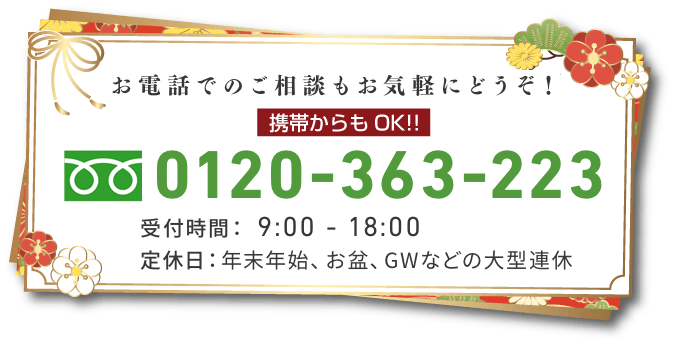 | 連絡先 | 【TEL】0120-363-223 【受付時間】9:00〜18:00 【定休日】年末年始、お盆、GW期間などの大型連休 【FAX】076-455-2430 【Email】お問い合わせはこちらから |